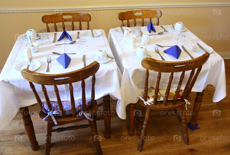 Небольшой уютный ресторан, красиво украшенный стол с столовыми приборами и