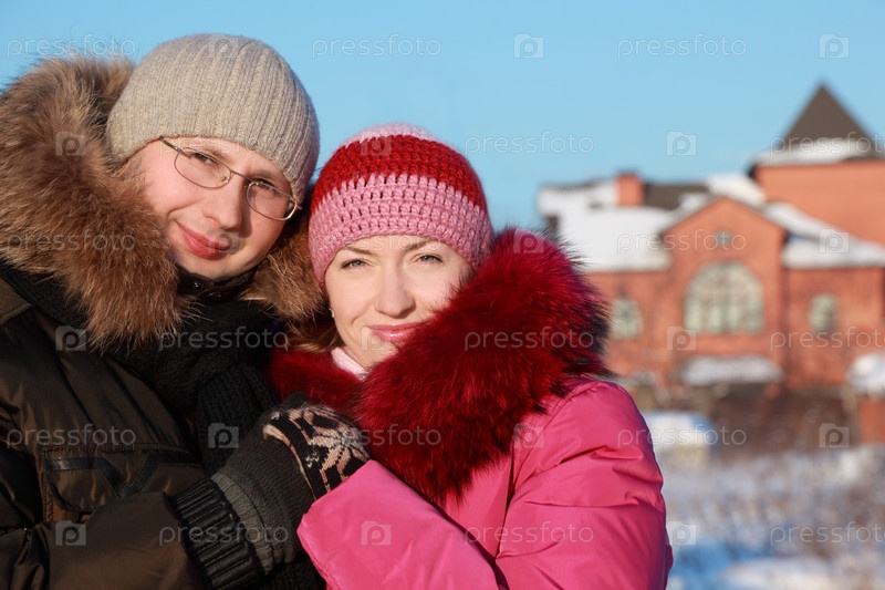 Красивая молодая женщина в розовом куртке и мужчина в очках зимой