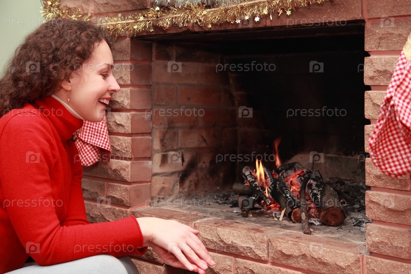 Молодая женщина в красном свитере улыбается рядом с горящим камином