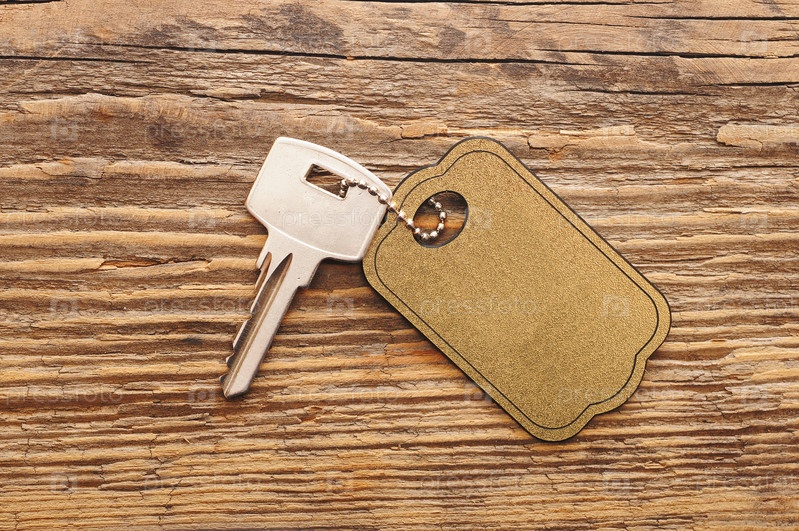 Серебряный ключ с пустым брелоком на деревянном фоне