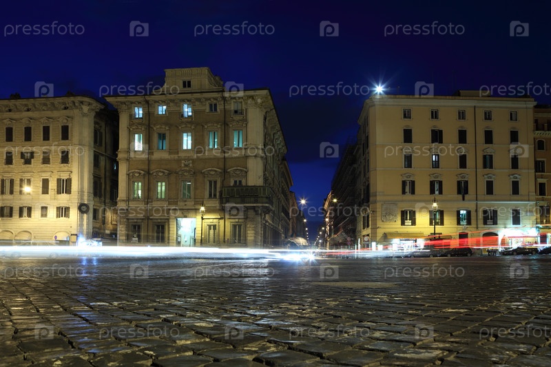 Дома и фонари на площади Венеция в летнюю ночь в Риме, Италия