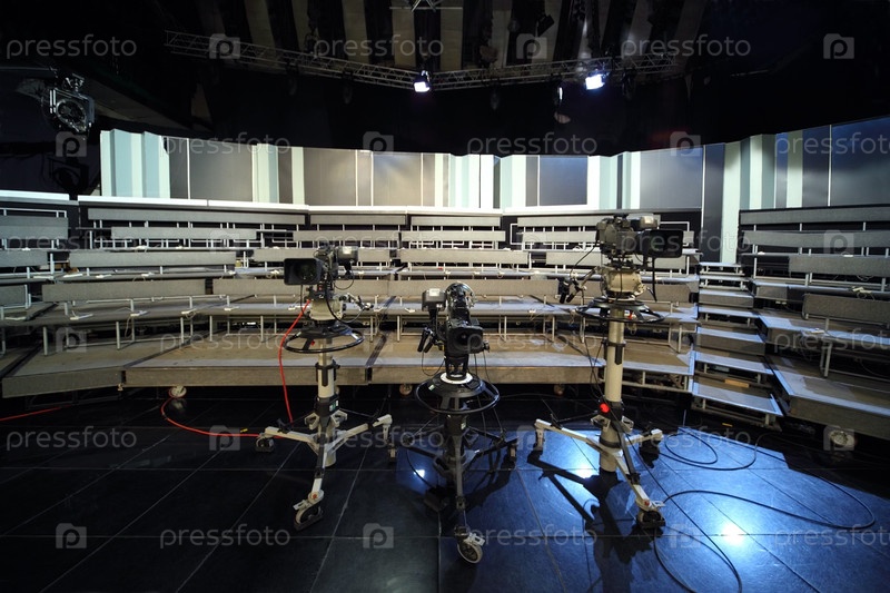 Профессиональные черные видеокамеры в телевизионной студии, места для трех человек