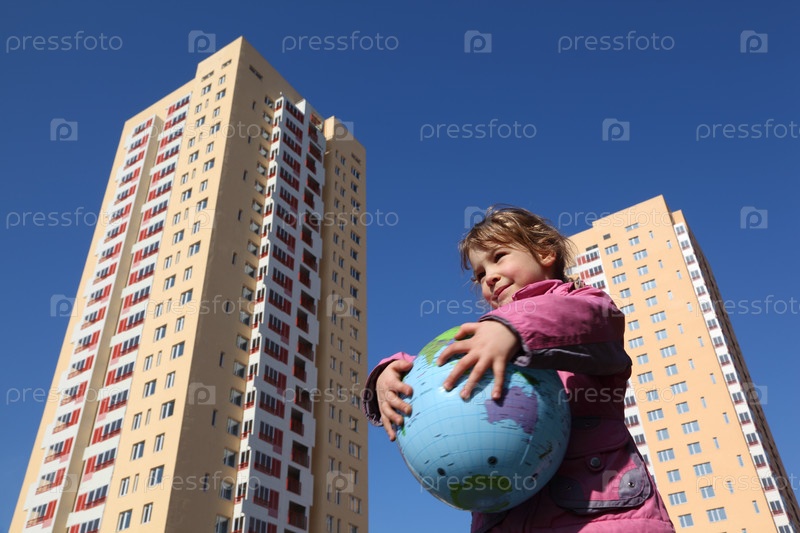 Маленькая девочка в розовом куртке держит в руках воздушный шар в форме земного шара