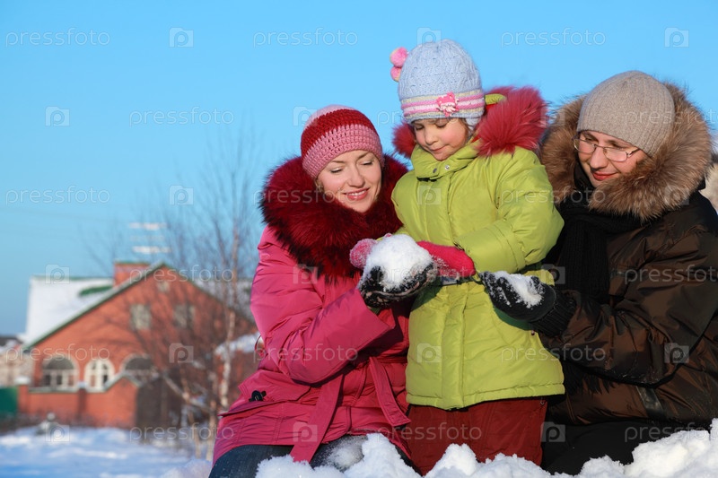 Отец и мать предлагают дочери сделать снежный шар на свежем воздухе в