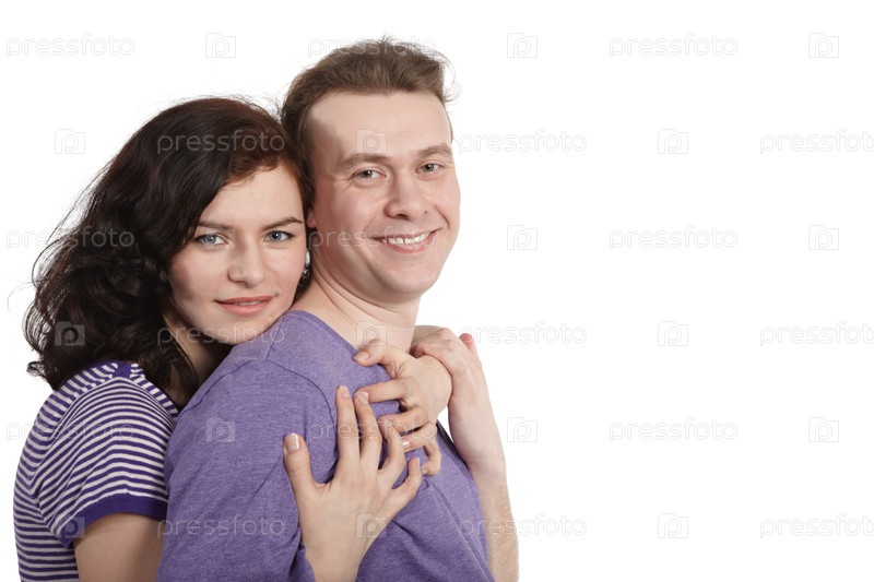 Молодая пара улыбается близко друг к другу на простом белом фоне