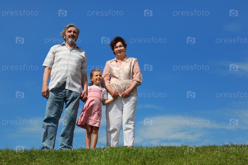 Маленькая девочка и ее бабушка с дедушкой стоят на лужайке и держатся за