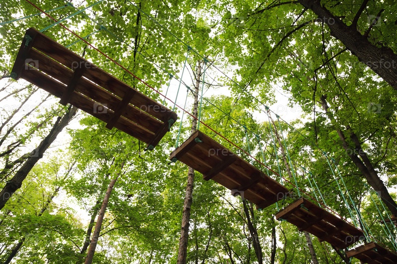 Опасная канатной дорога с веревкой в парке веревок, деревья со зелеными листьями