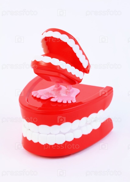 Маленькая игрушечная часовая челюсть с белыми зубами стоит на большой челюсти на белом