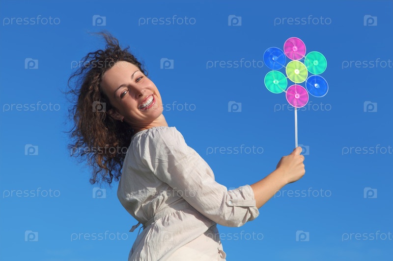 Веселая женщина излучает теплую, сияющую улыбку и держит в руках яркую