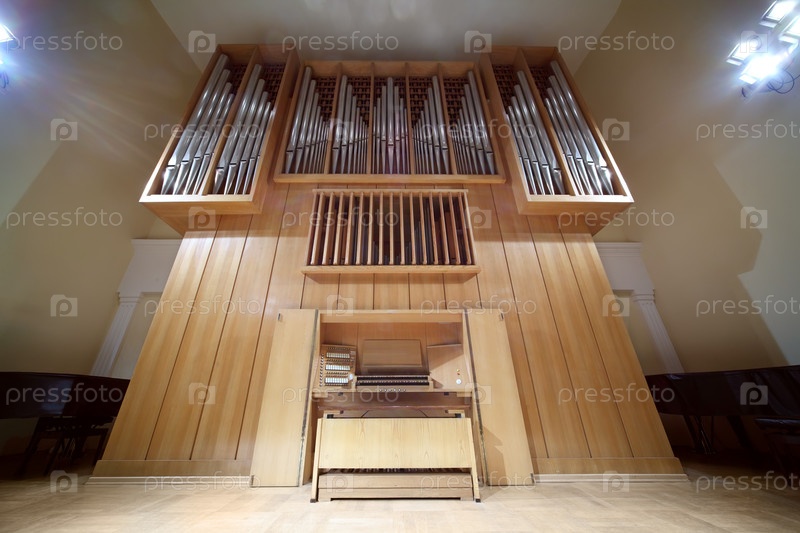 Массивный деревянный трубной орган с длинными металлическими трубами; панель управления