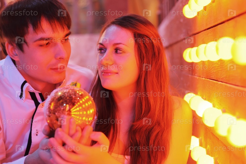 Молодой мужчина и молодая женщина стоят у стены с маленькими лампами, держа Рождество