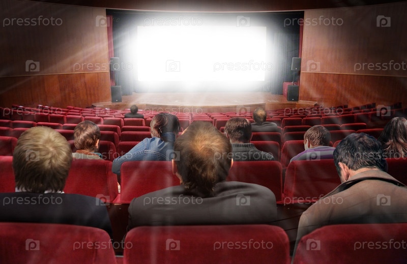 Зрители сидят в театре, лицом к яркому экрану