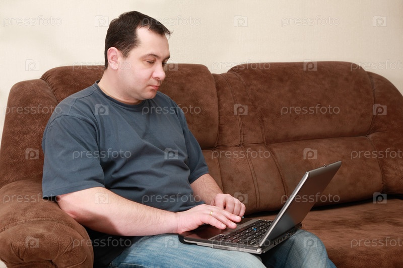 Мужчина сидит на диване и работает с ноутбуком дома, сконцентрированный