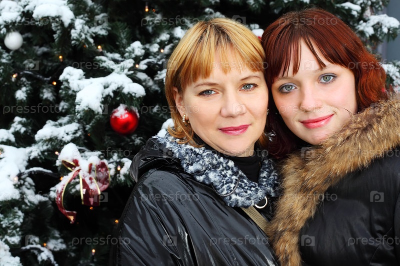 Две женщины тепло позируют рядом с заснеженной рождественской елкой