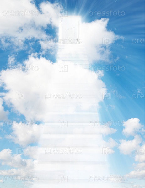 Белая лестница поднимается в яркое небо, обрамленное пушистыми облаками