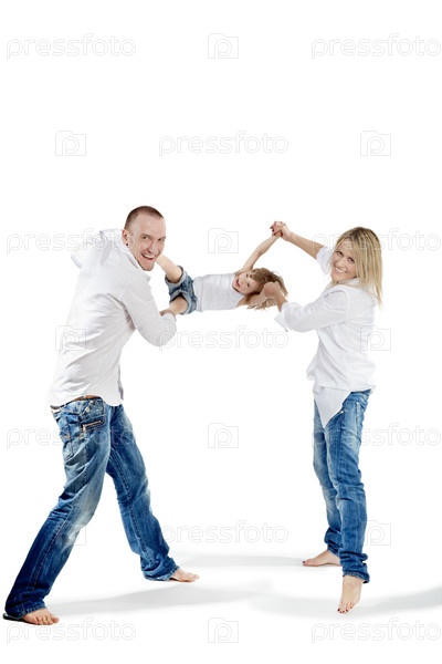 Отец и мать в белых рубашках и синих джинсах качают свои