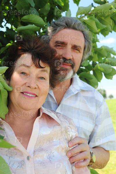 Улыбающаяся пожилая пара стоит под зелеными листьями