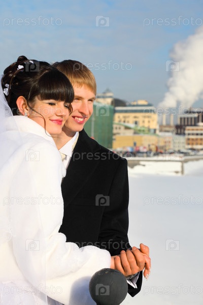 Жених и невеста держатся за руки на зимней природе, счастливая пара