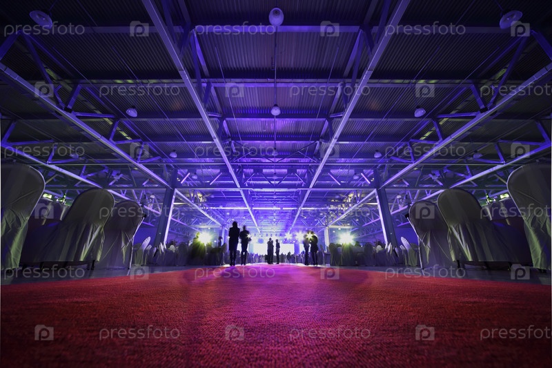 Люди стоят, сидят за столом и смотрят на световую сцену в вечеринке; спины