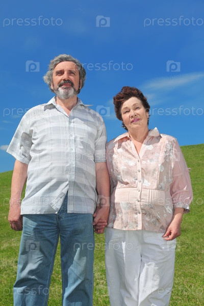 Пара стоит на зеленом поле под ярко-синим небом