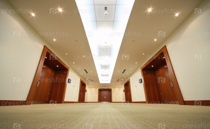 Длинный желтый коридор с коричневыми деревянными дверями, дверь в конце коридора