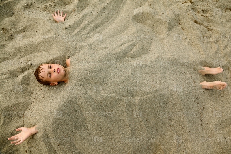 Маленький мальчик после купания похоронен в песке на пляже, много желтого