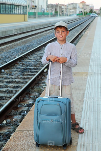 Мальчик стоит на железнодорожной платформе с чемоданом