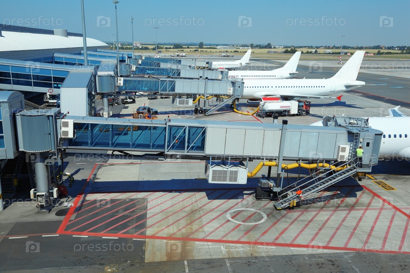 Немногие авиалайнеры, припаркованные в аэропорту. пассажирские посадки. обслуживание