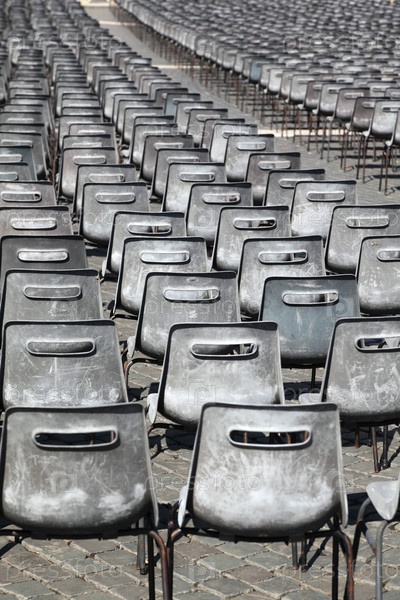 Ряд выветрившихся пластиковых стульев сидит на улице