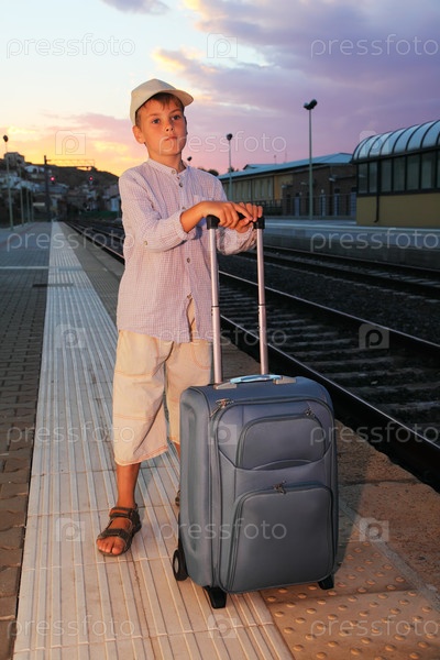 Мальчик стоит с чемоданом на платформе железнодорожной станции