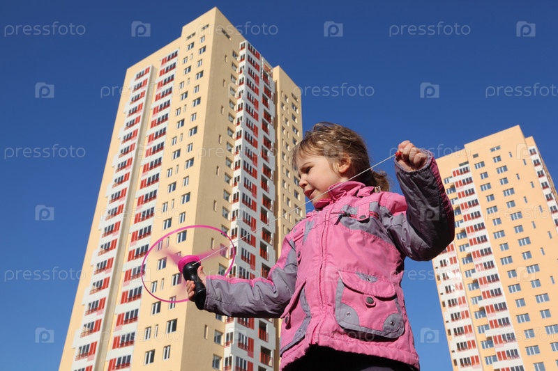 Красивая маленькая девочка в розовом куртке, играет с винтом. in