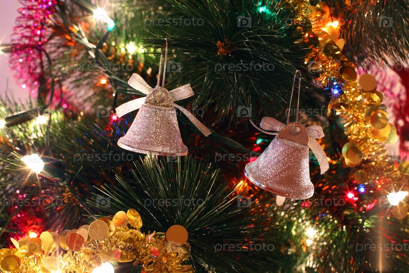 Сверкающие колокола висят на праздничной, освещенной рождественской елке