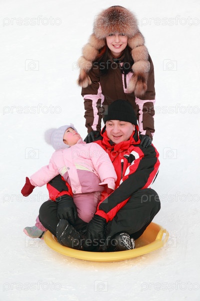 Отец со своей маленькой дочерью на снежной тарелке в снегу, мать