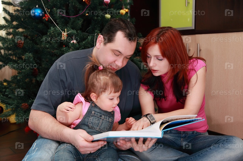 Мать, отец и маленькая дочь сидят на полу и читают книгу