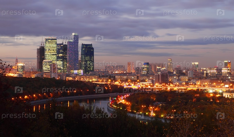 Вечерняя панорама Московского городского комплекса небоскребов и реки в