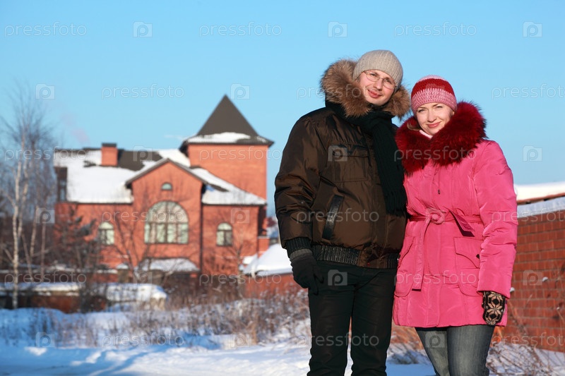 Красивая молодая женщина в розовом куртке и мужчина в очках стоят