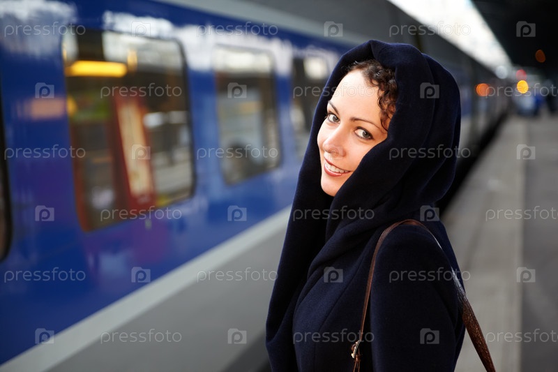 Женщина улыбается на железнодорожной станции, пальто в капюшоне