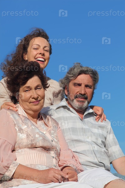 Взрослая дочь обнимает своих родителей и улыбается, голубое небо, сосредоточиться на
