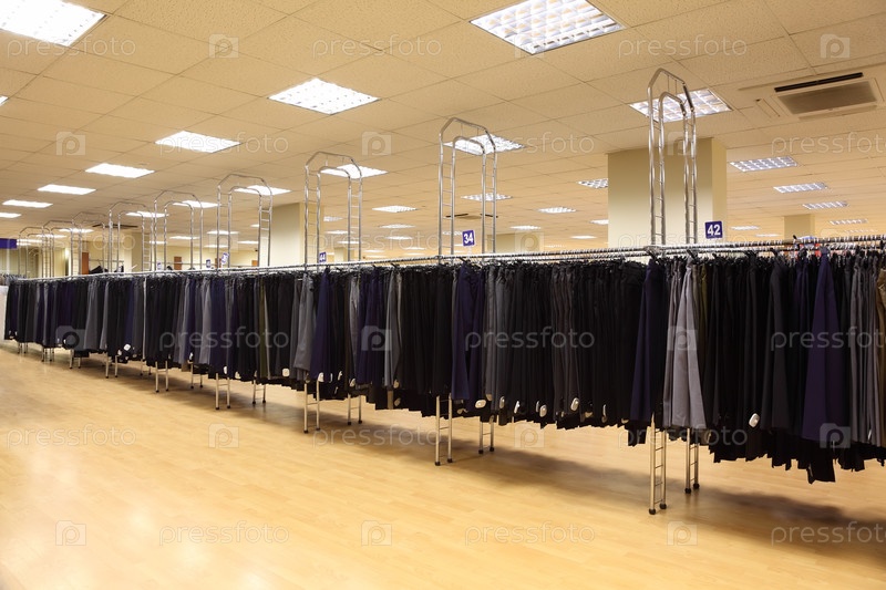 Рядовые мужские брюки на вешалки в большом световом магазине; различные размеры; Школа