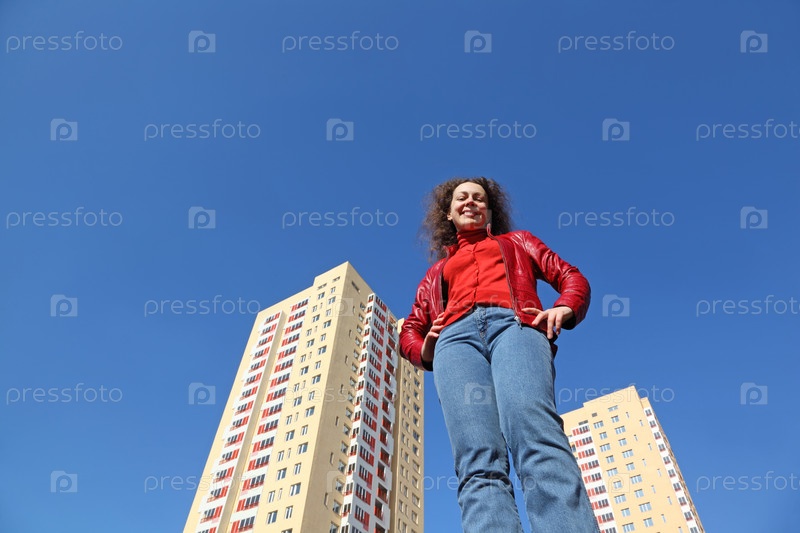 Красивая молодая женщина в красной куртке и синих джинсах улыбается. in