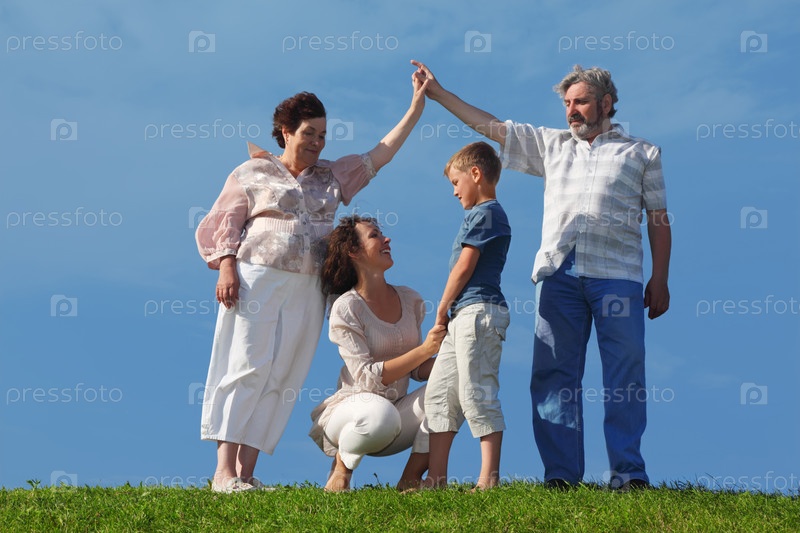 Мать и сын держатся за руки, бабушка и дедушка делают крышу дома