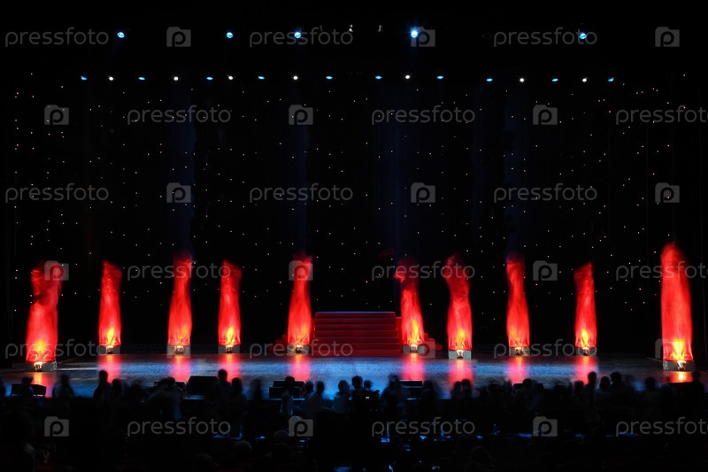 Красные пламени поднимаются за ступеньками сцены в темном театре
