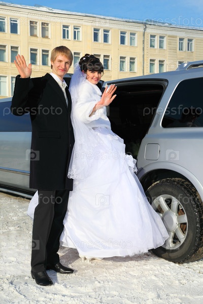 Улыбающиеся жених и невеста стоят возле свадебного лимузина, размахивая своими