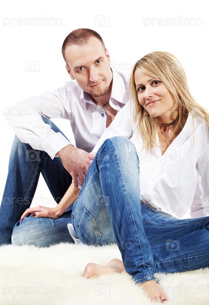 Молодая пара в белых рубашках и синих джинсах сидит на волосатой