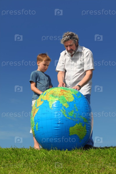 Мальчик и его дедушка стоят на лужайке и смотрят на большую надувную машину