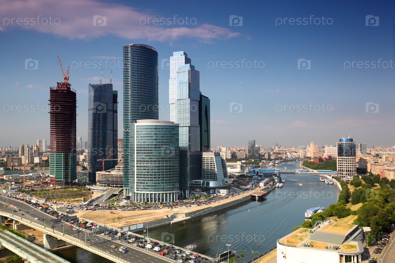 Современные небоскребы стоят рядом с текущей рекой