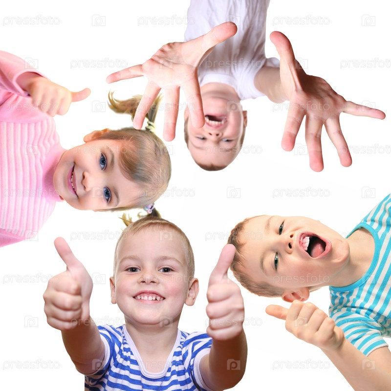Четыре радостных ребенка улыбаются и жестуют в сторону камеры