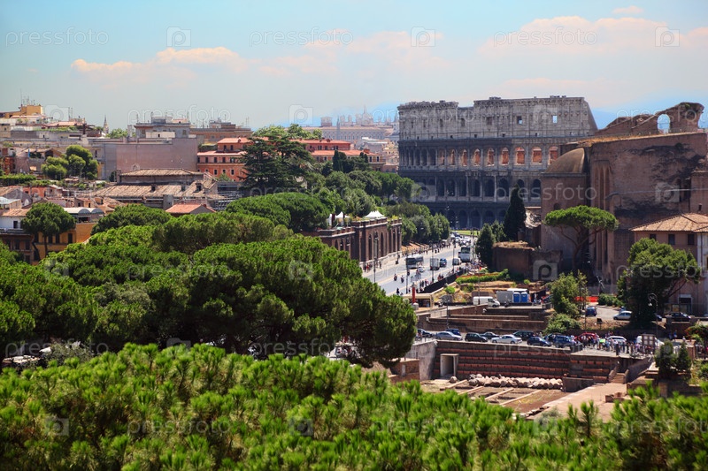 Цветный панорамный вид на Рим, Колизей, католические базилики и улицы