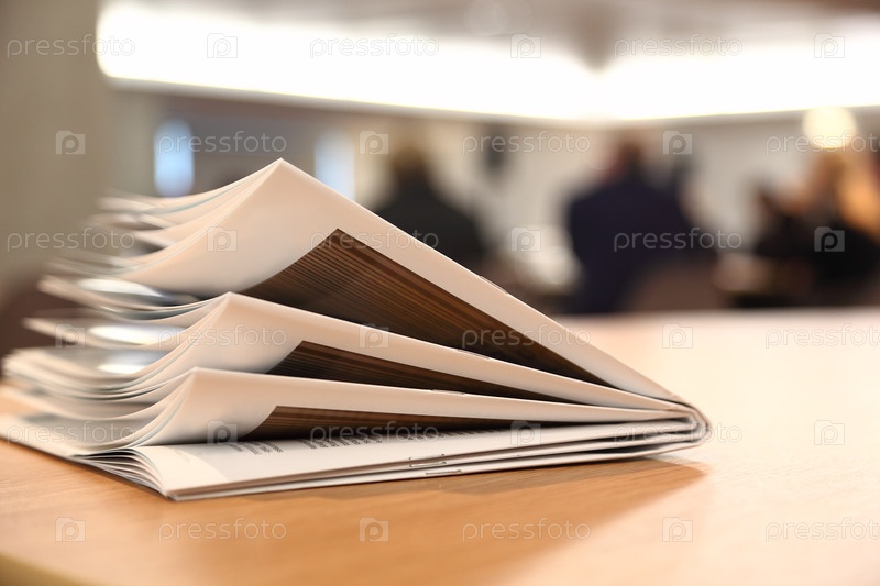 Брошюры на световом столе в светлой комнате, несколько брошюр складываются
