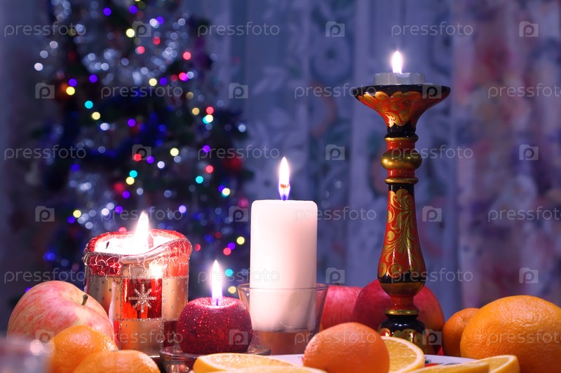 Украшенный рождественский обеденный стол со свечами и елкой в